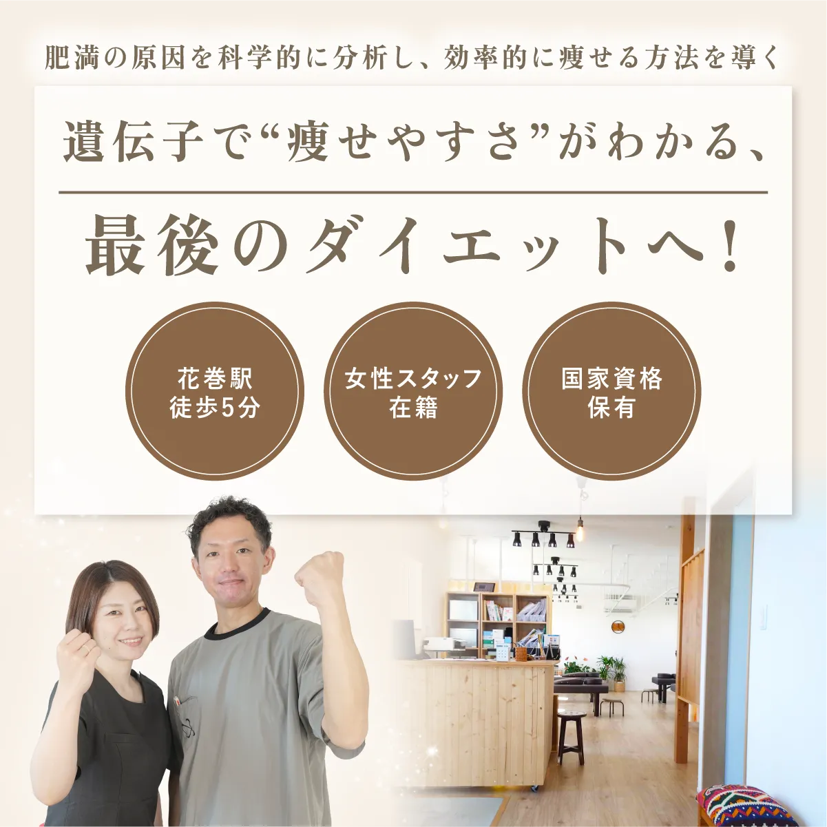脂肪の吸収や代謝が 糖のエネルギー変換が弱く、 筋肉が付きにくく、 花巻駅から徒歩5分で忙しい方でも通いやすいです。お仕事や家事の合間に、美容と健康に向き合いやすいです。 医師や医療従事者からも信頼される施術です。 アットホームな雰囲気の中で、リラックスして施術が受けられます。 ダイエットや体質改善を実感できる施術です。 トータルケアで、体型・肌・体質をまとめて整える施術です。 カウンセリングシートにご記入いただき、お悩みやご要望をお伺いします。 現在のお体の状態をチェックし、最適な施術プランを提案します。 美容鍼灸や整体を組み合わせたトータルケアを行います。 施術後の注意点やセルフケア方法をお伝えします。 次回の施術やアフターケアについてご案内します。こんなお悩み